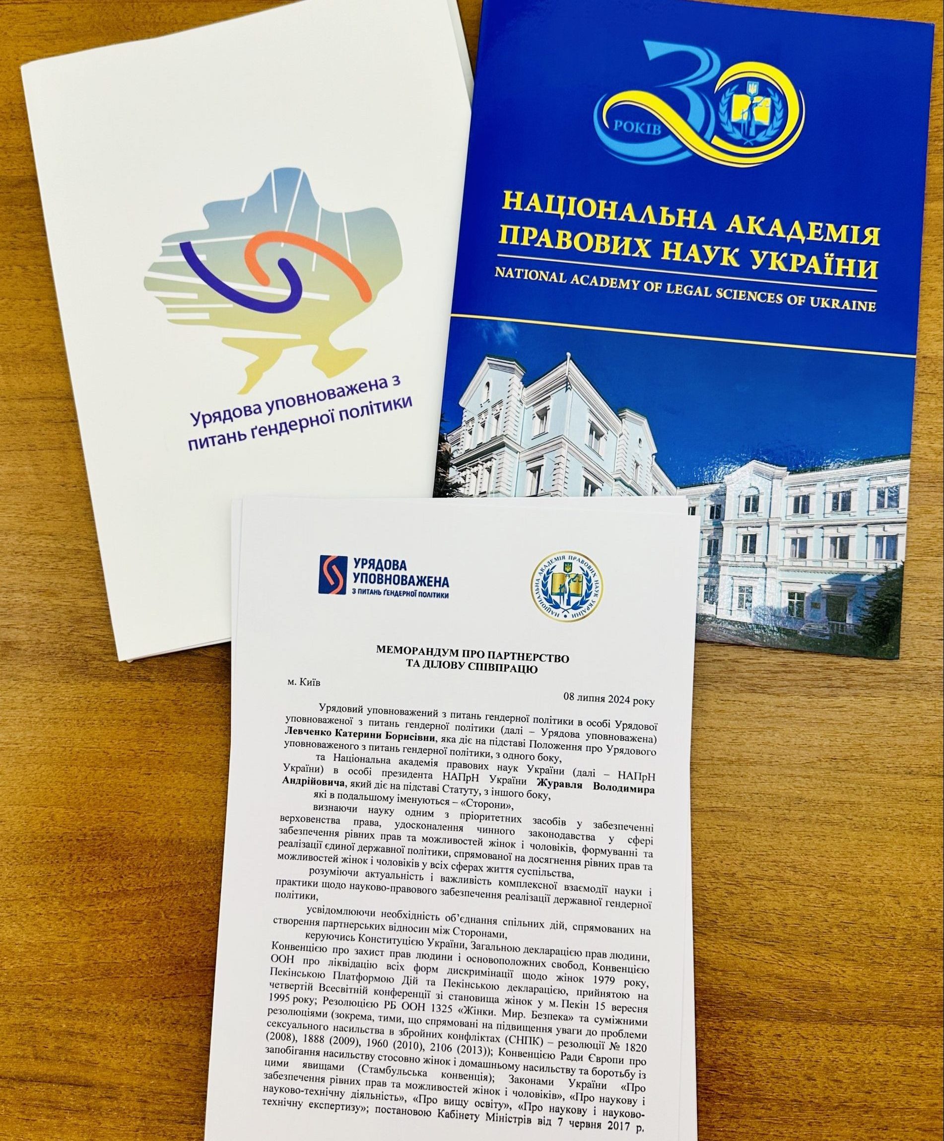 8 липня 2024 року відбулась зустріч Урядової уповноваженої з питань гендерної політики Катерини Левченко та президента Національної академії правових наук України Володимира Журавля, в ході якої сторони підписали Меморандум про партнерство та ділову співпрацю.